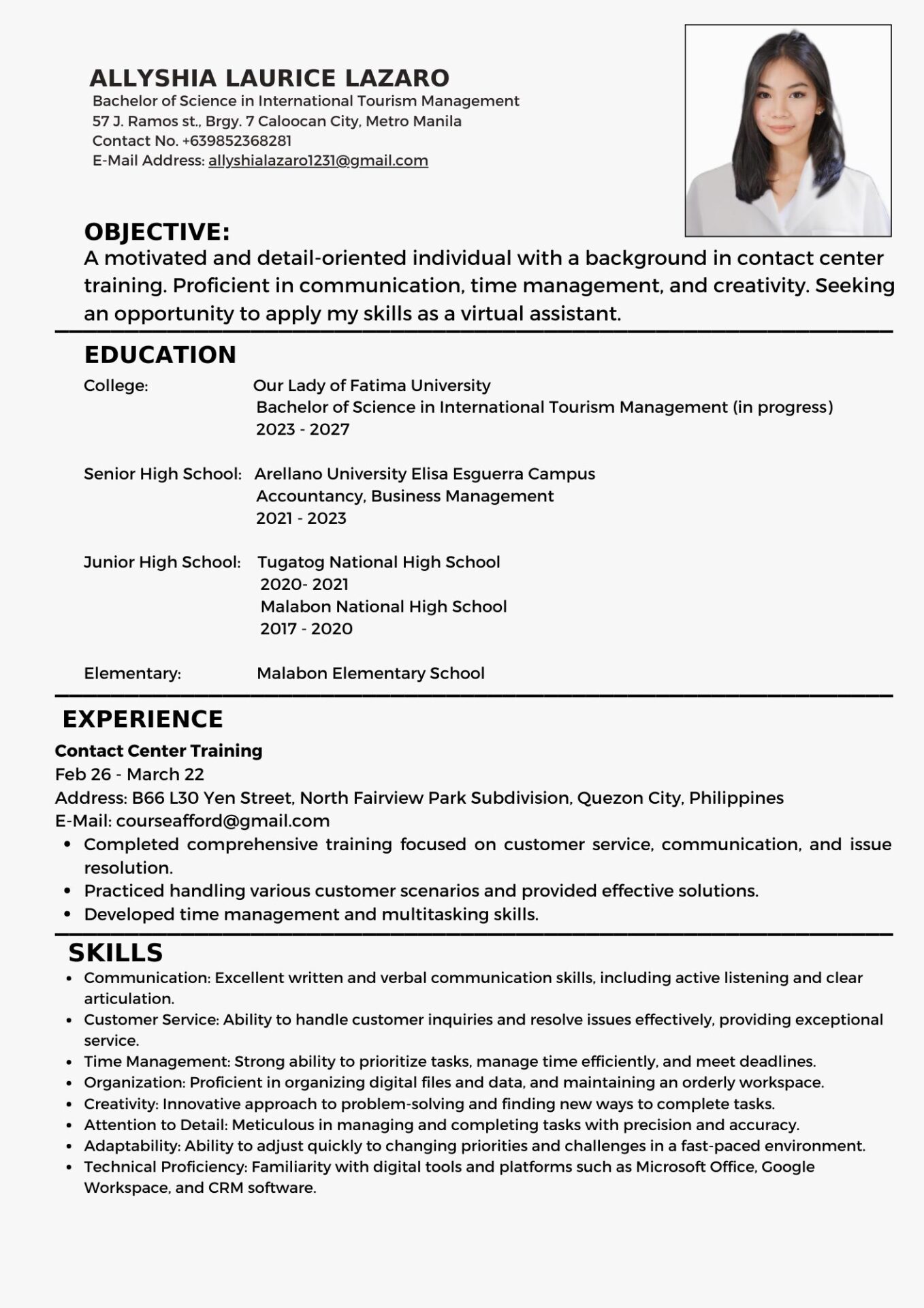 A motivated and detail-oriented individual with a background in contact center training. Proficient in communication, time management, and creativity. Seeking an opportunity to apply my skills as a virtual assistant at VA Hub.
