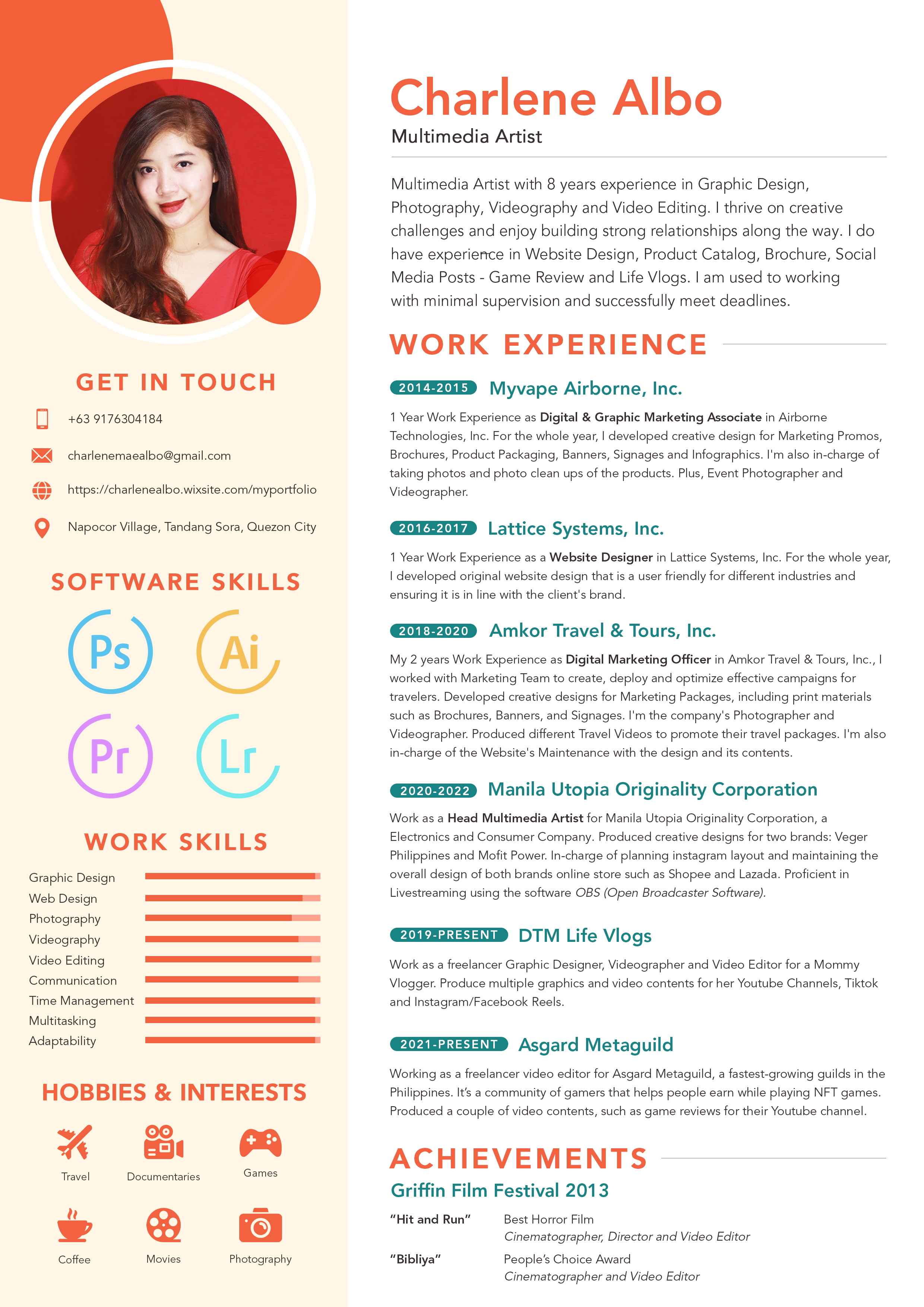1 Year Work Experience in Airborne Technologies, Inc. For the whole year, I developed creative design for Marketing Promos, Brochures, Product Packaging, Banners, Signages and Infographics. I’m also in-charge of taking photos and photo clean ups of the products. Plus, Event Photographer and Videographer.