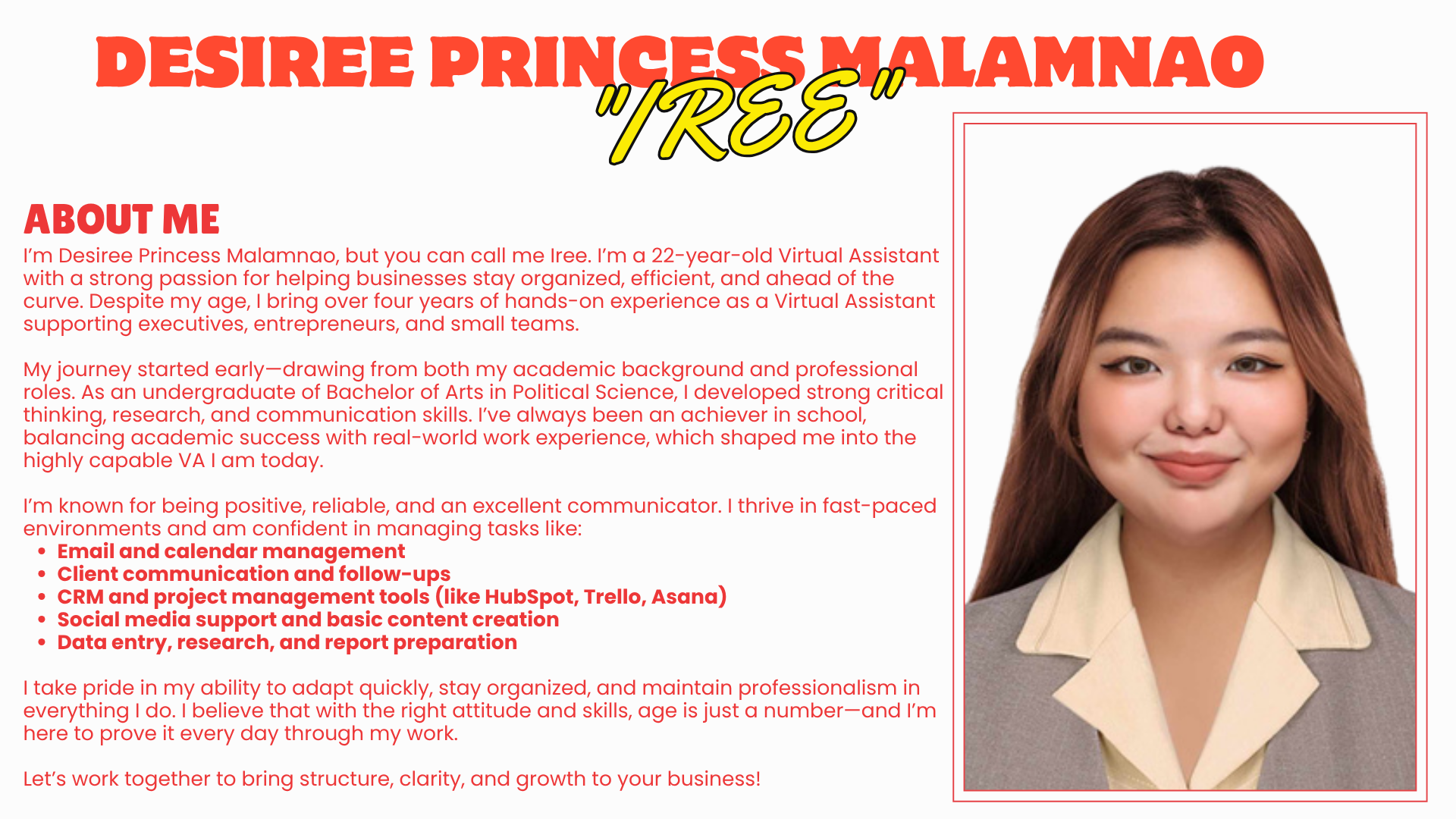 I’m Desiree Princess Malamnao, but you can call me Iree. I’m a 22-year-old Virtual Assistant with a strong passion for helping businesses stay organized, efficient, and ahead of the curve. Despite my age, I bring over four years of hands-on experience as a Virtual Assistant supporting executives, entrepreneurs, and small teams.