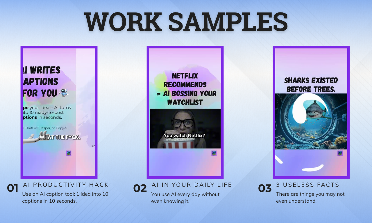 • Short-form video production for TikTok, Instagram Reels and YouTube Shorts. I write hooks, layer quick edits, add clear captions, and optimize pacing so people stop scrolling.