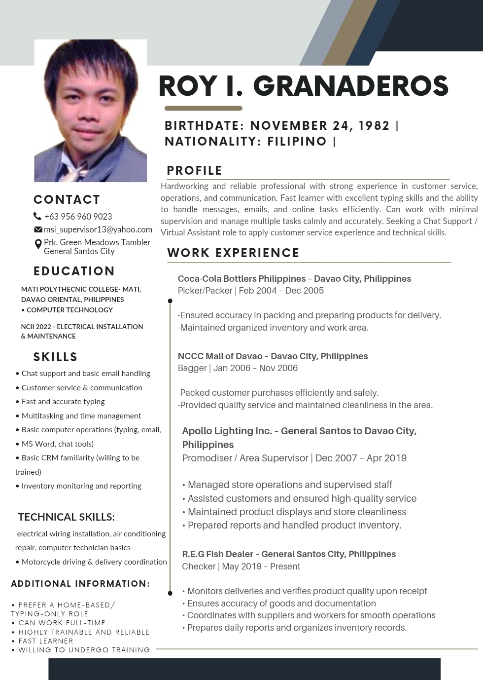Hi! I’m Roy Granaderos, Hardworking and reliable professional with strong experience in customer service, operations, and communication.